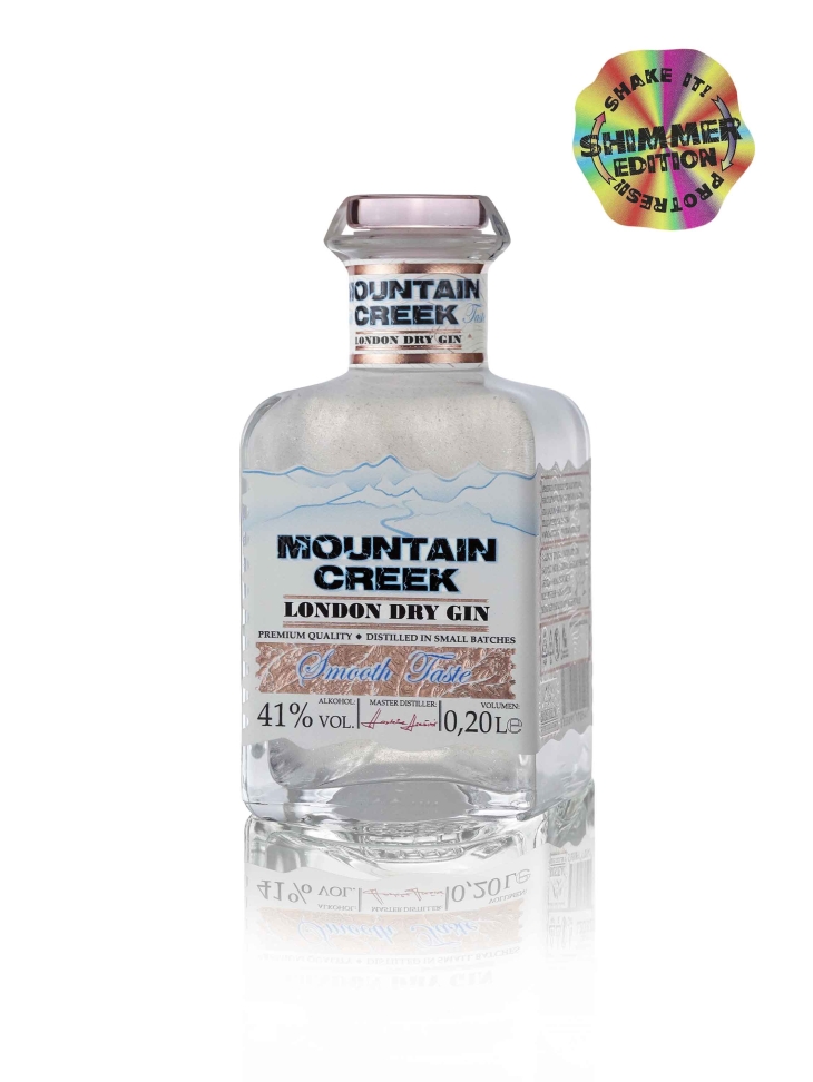 GIN Mountain Creek london dry SHIMMER EDITION gin je premium craft gin nastao od vrhunskog pšeničnog destilata, pažljivo odabranog bilja i meke planinske izvorske vode. Baza gina je premium pšenični destilat, destiliran kroz sedam kolona, savršeno neutralan i idealan za proizvodnju premium gina. Gin je proizveden od 29 vrsta pažiljivo odabranog aromatičnog bilja, pa osim tradicionalnog bilja poput borovice, angelike, korijandera, lavande, kadulje, matičnjaka, slatkog korijena i drugih biljaka, poseban naglasak stavljen je na citrusne arome limuna i naranče koje ovom ginu daju posebnu voćnost i svježinu. Sve to zajedno destilirano je i pomiješano sa vrhunskom izvorskom vodom prirodno filtiranom kroz slojeve stijena starijih od 600 milijuna godina iz Geoparka Papuk, koja u konačnici ovom ginu daje apsolutnu mekoću na okusu, te ga čini savršenim i bez miješanja sa tonicom.