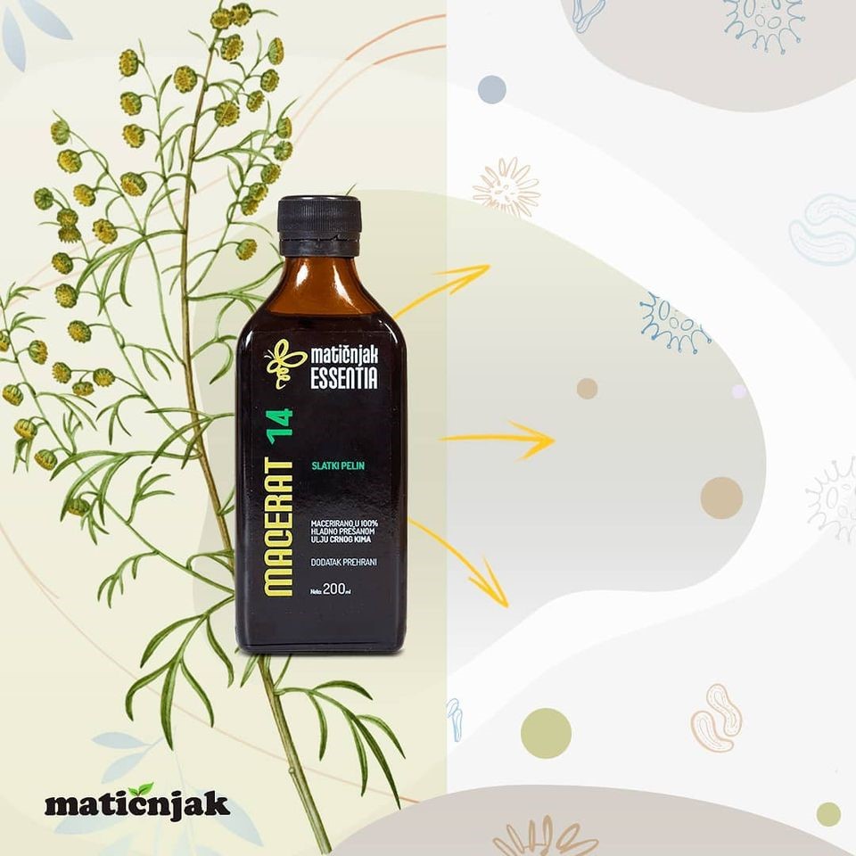 Matičnjak u svojoj ponudi ima uljni macerat slatkog pelina. Napravljen od 100% hladno prešanog ulja crnog kima čijim svakodnevnim uzimanjem definitivno možete zaštiti svoj imunitet. Dokazano djeluje kao vrlo jak saveznik u borbi protiv virusa, bakterija i infekcija.