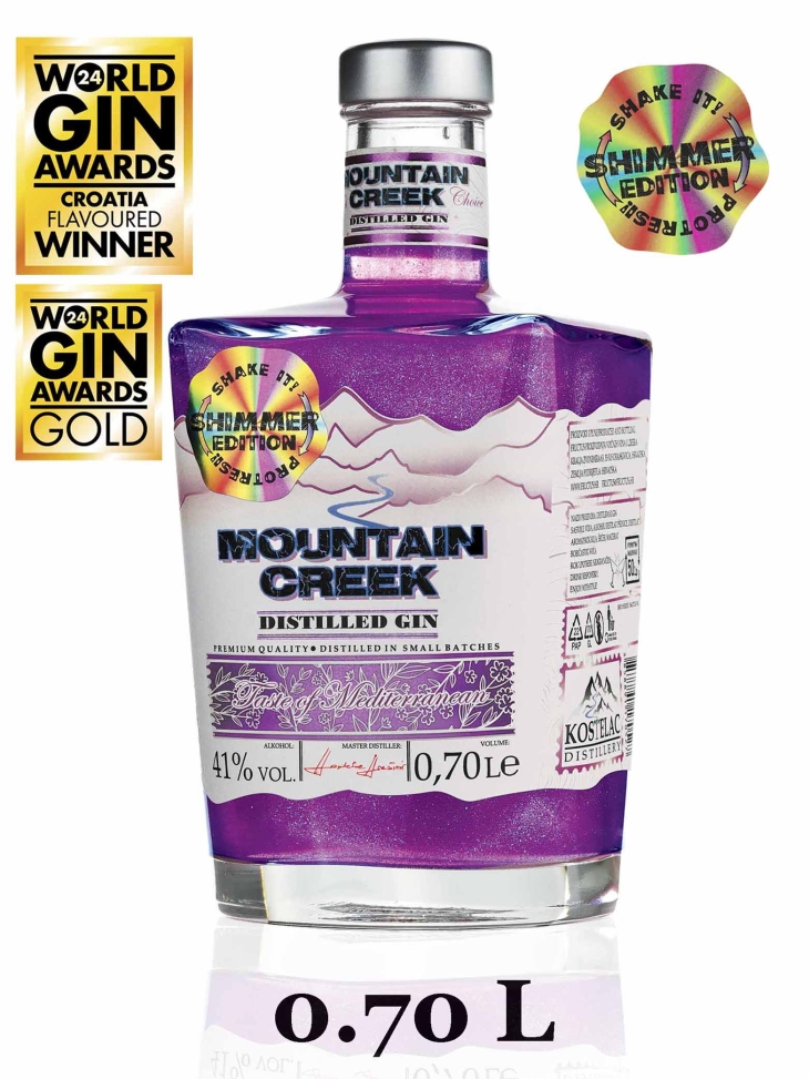GIN Mountain Creek taste of mediterranean SHIMMER EDITION gin je premium craft gin proizveden od najboljih sastojaka, najkvalitetnijeg pšeničnog destilata, pažljivo biranog bilja, te meke planinske izvorske vode iz Unesco Geoparka i Parka prirode Papuk. Kreiran mješavinom pomno biranih biljnih sastojaka, nudi skladnu kombinaciju okusa koja vas nosi na suncem okupane obale Mediterana. Svakim gutljajem možete osjetiti esenciju jarkih agruma, te mirisnog i aromatičnog bilja, prvenstveno cvjetne lavande, te neodoljivog ružmarina. U kombinaciji sa izvorskom vodom i premium destilatom rezultira filigranskom glatkoćom i dubinom okusa. Aroma gina je istovremeno osnažujuća i umirujuća , stvarajući nezaboravno osjetilno iskustvo koje će vas rapsodijom svojeg okusa zasigurno odvesti u vrtove na osunčanim obalama Mediterana. Taste of Mediterranean je gin punog tijela i karaktera koji nudi uistinu očaravajući okus i miris bilo da se uživa samostalno ili u koktelu.